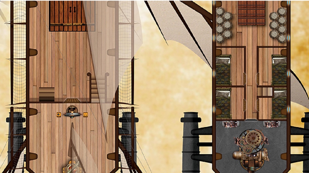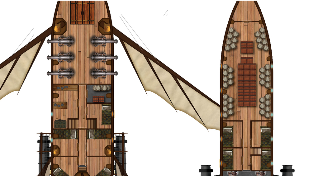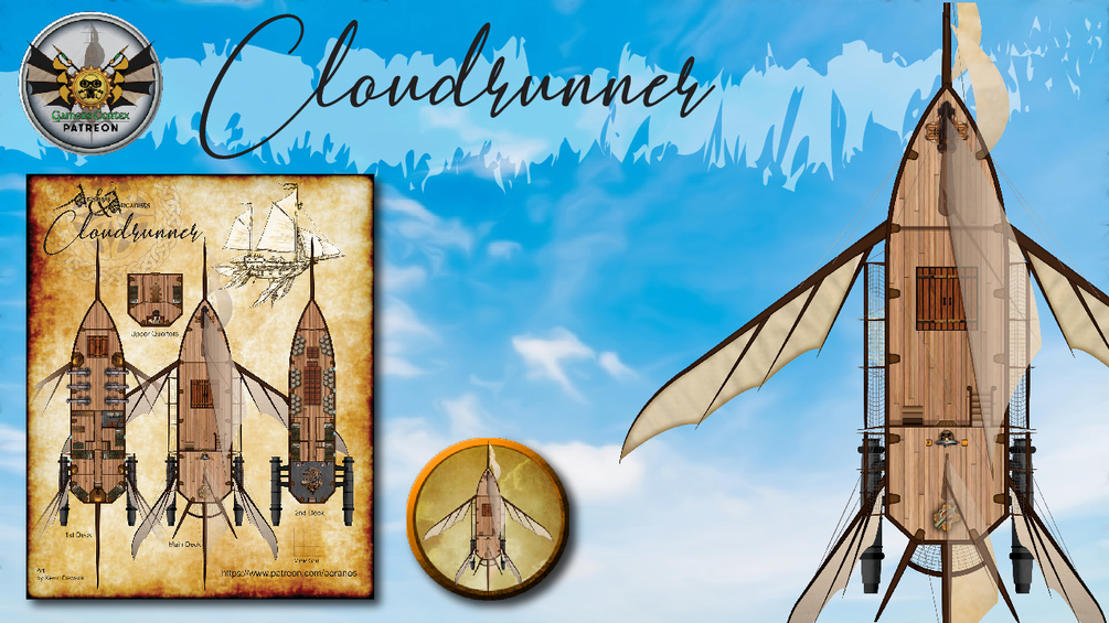 The heart of the Deorian merchant fleet, The cloudrunner comes in lots of configurations. This is but one standard layout with enough guns to dissuade pirates and enough arcanic power to outrun those who are persistent.